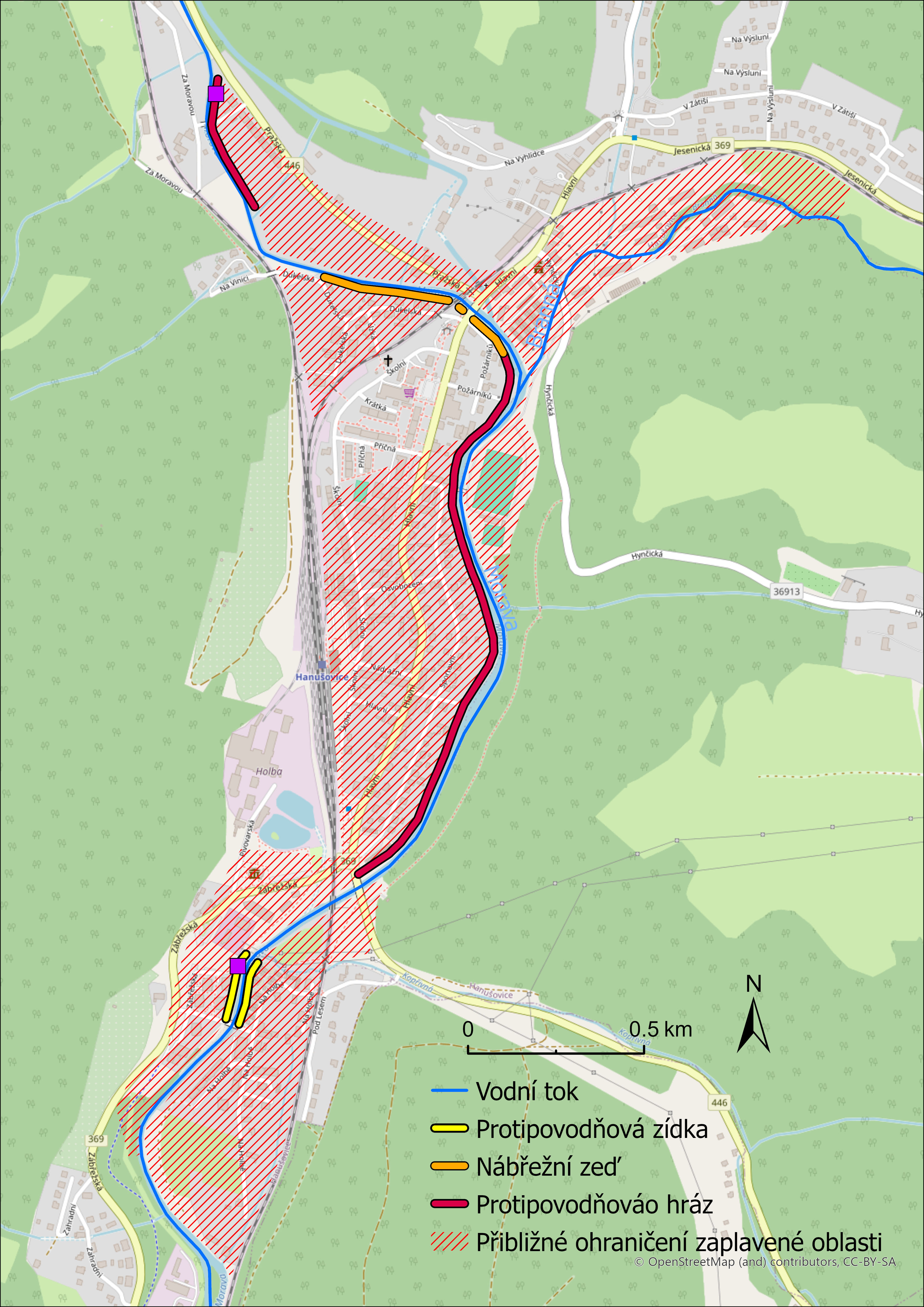 Obr. 1 Mapa protipovodňových opatření v Hanušovicích se záplavovými oblastmi. Zdroj dat: DIBAVOD, ČSÚ. Autor: Jan Brynych.